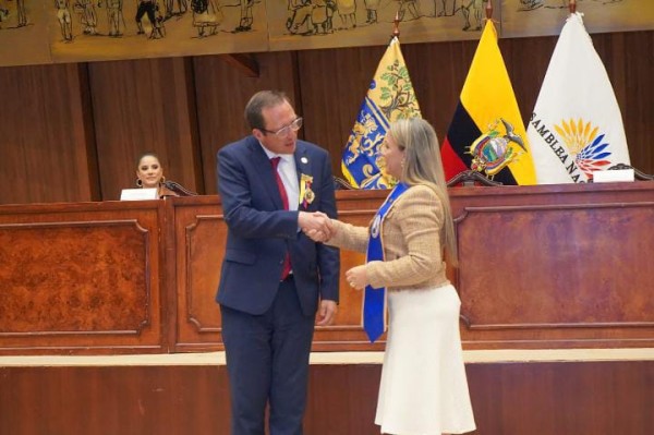 The important ceremony took place on the 25th of November at the National Assembly, and the Decoration was presented by the Honorable Victoria Quintana, member of the National Assembly for Guayas and secretary of the National Assembly Group dealing with the United Kingdom. The ceremony was attended by the former Vice Minister of Government and incoming Consul General of Ecuador to Madrid, the Honorable Justina Zambrano, by more than fifteen members of the National Assembly of Ecuador, by five parliamentarians of the Andean Parliament, and by representatives and rectors from over twenty universities.
