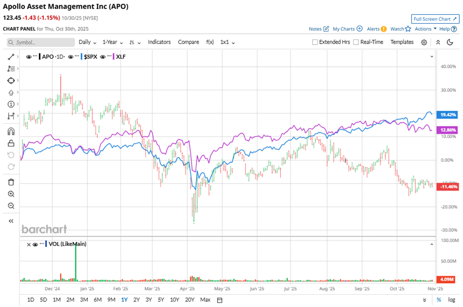 Shares of this private equity giant have underperformed the broader market considerably over the past year. APO has declined 15.4% over this time frame, while the broader S&P 500 Index ($SPX) has rallied nearly 17.4%. In 2025, APO stock is down 25.3%, compared to the SPX’s 16% gains on a YTD basis.