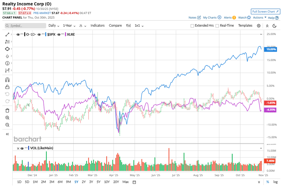 Shares of this REIT giant have underperformed the broader market considerably over the past year. O has declined 4.3% over this time frame, while the broader S&P 500 Index ($SPX) has rallied nearly 17.4%. In 2025, O stock is up 8.4%, compared to the SPX’s 16% gains on a YTD basis.