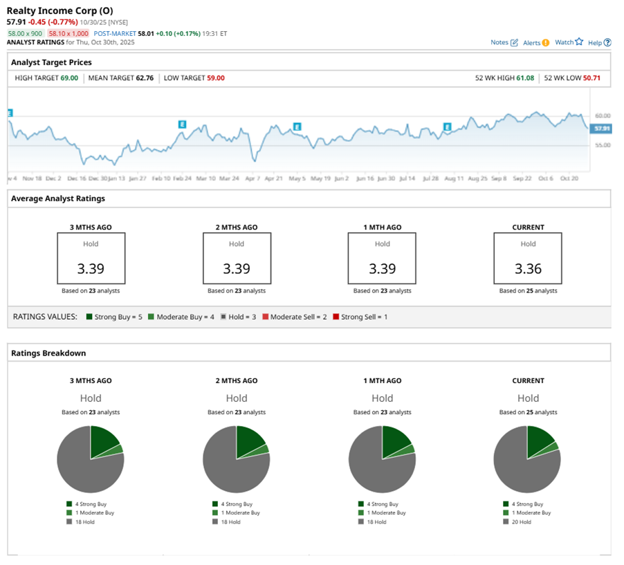 On Oct. 28, Ronald Kamdem from Morgan Stanley (MS) maintained a “Hold’ rating on O with a price target of $62, implying a potential upside of 7.1% from current levels.