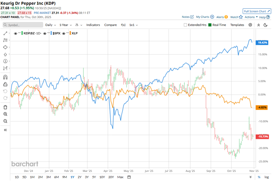 Shares of the Burlington, Massachusetts-based company have underperformed the broader market over the past 52 weeks. KDP stock has fallen 16.9% over this time frame, while the broader S&P 500 Index ($SPX) has gained 17.4%. Moreover, shares of the company are down 14.6% on a YTD basis, compared to SPX’s nearly 16% increase.