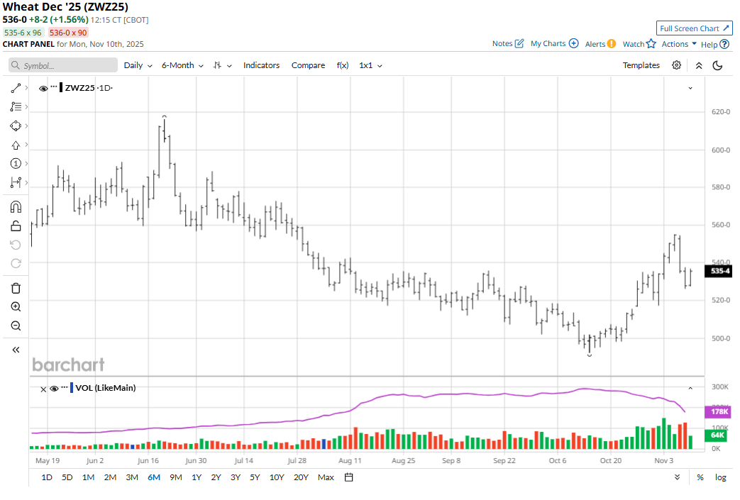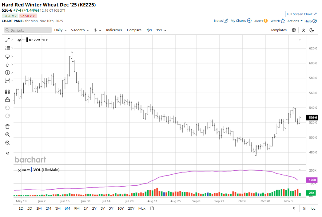 The corn (ZCZ25) and winter wheat futures (KEZ25) (ZWZ25) markets sputtered late last week. December corn was down 4 1/4 cents for the week. December soft red winter wheat fell 6 1/4 cents on the week and December hard red winter wheat lost 5 1/4 cents for the week. Friday’s technically bearish weekly low close in December corn and the winter wheat futures markets puts the bulls on the defensive early this week.