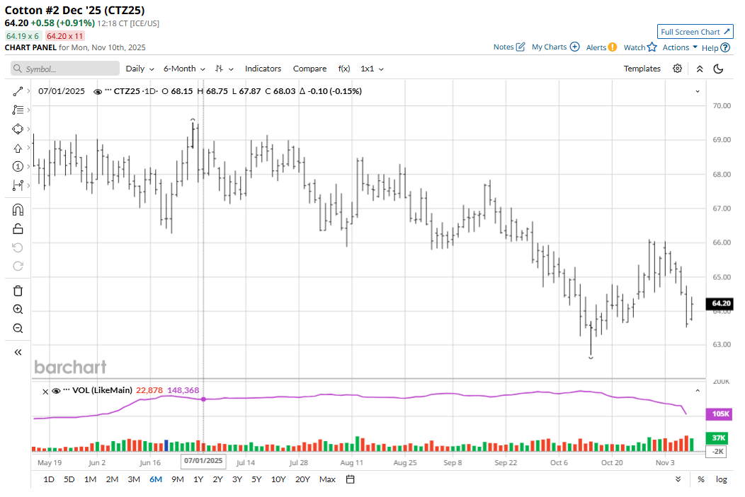 December cotton (CTZ25) futures on Friday fell 92 points to 63.62 cents and for the week were down 192 points. The cotton bulls laid an egg last week, allowing Friday’s technically bearish weekly low close to set the table for follow-through, chart-based selling from the speculators early this week. Recent price history shows fledgling price uptrends in cotton futures, like the one that was just negated by Friday’s price action, tend to fizzle out after only a few weeks.