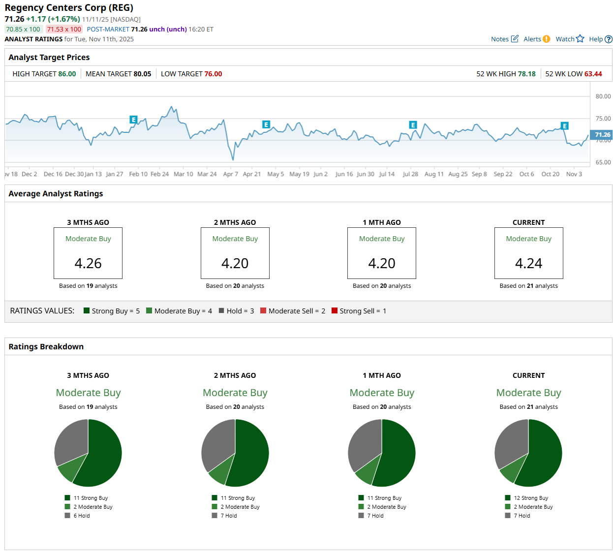 On Nov. 11, RJ Milligan from Raymond James Financial, Inc. (RJF) maintained a “Buy” rating on REG, with a price target of $80, indicating a 12.3% potential upside from the current levels.