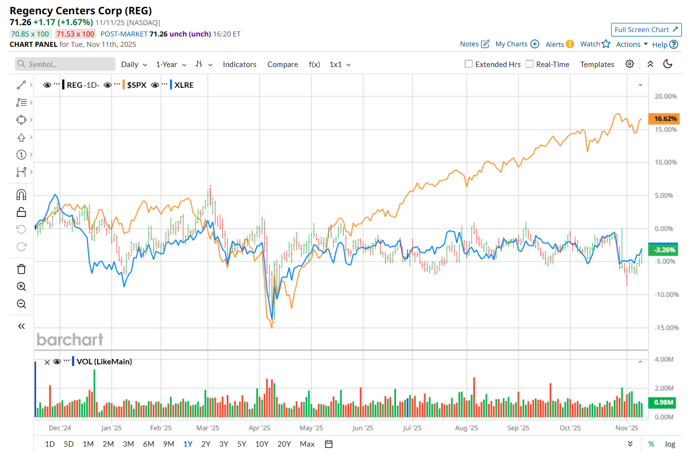 On Oct. 28, REG delivered its Q3 results. The company’s same property Net Operating Income (NOI) increased 4.8% year-over-year to $274.2 million, while its FFO of $1.15 advanced 7.5% from the year-ago quarter, meeting analyst estimates. Additionally, REG raised its fiscal 2025 guidance, now expecting Nareit FFO in the range of $4.62 to $4.64 per share and core operating earnings between $4.39 and $4.41 per share. Yet, its shares plunged 3.1% in the following trading session.