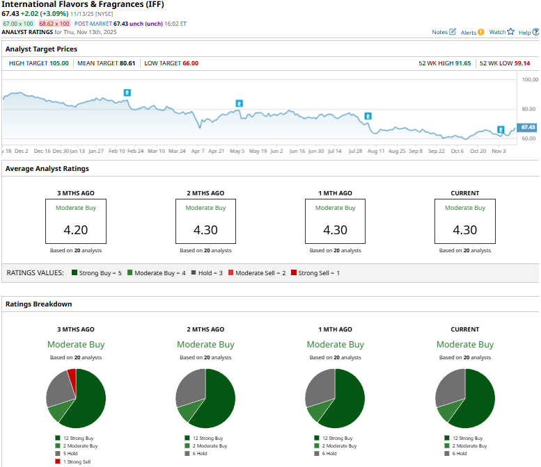 On Nov. 7, Barclays (BCS) analyst Lauren Lieberman reiterated an “Overweight” rating on IFF and raised the price target from $72 to $75.