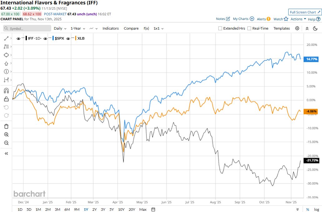 International Flavors has significantly underperformed the broader market over the past year. IFF stock has tanked 20.3% on a YTD basis and nearly 25% over the past 52 weeks, compared to the S&P 500 Index’s ($SPX14.6% gains in 2025 and 12.6% returns over the past year.