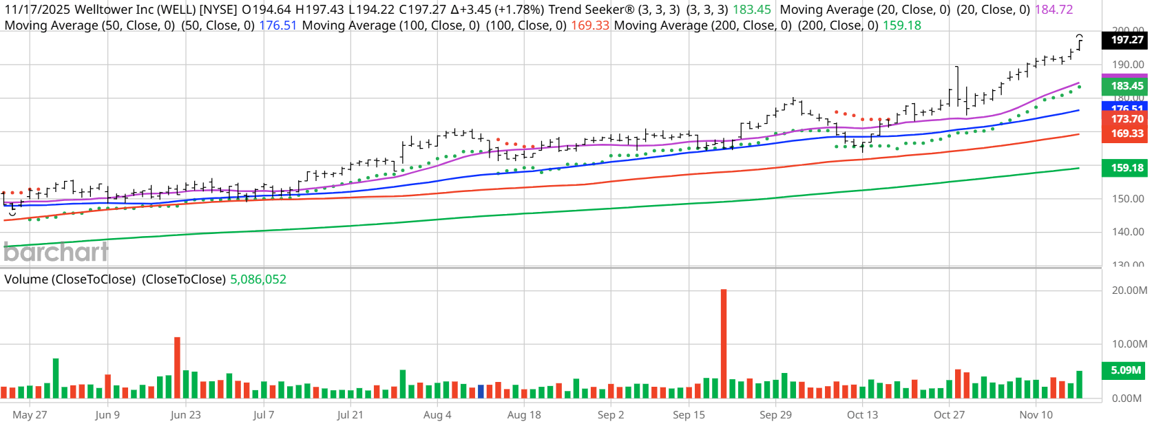Welltower hit an all-time high of $199.11 in morning trading on Nov. 18.