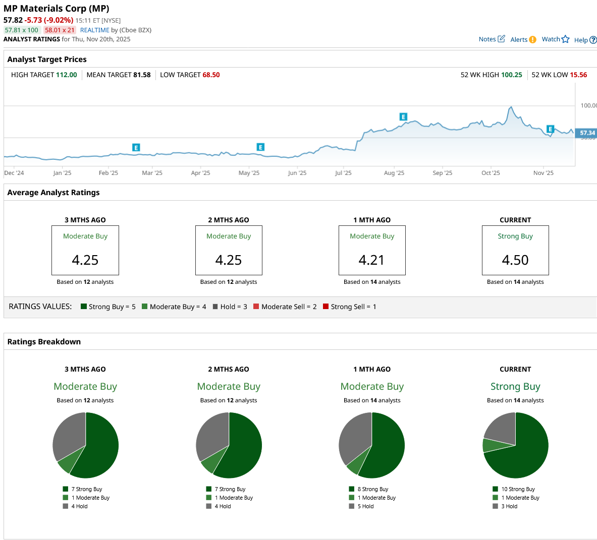 If MP Materials stock is priced at 35x forward earnings, which is reasonable, it could trade around $92 in late 2028, indicating an upside potential of almost 50% from current levels. Out of the 14 analysts covering MP stock, 10 recommend “Strong Buy,” one recommends “Moderate Buy,” and three recommend “Hold.” The average stock price target for the rare earth miner is $81.58, above its current price of $57.82.