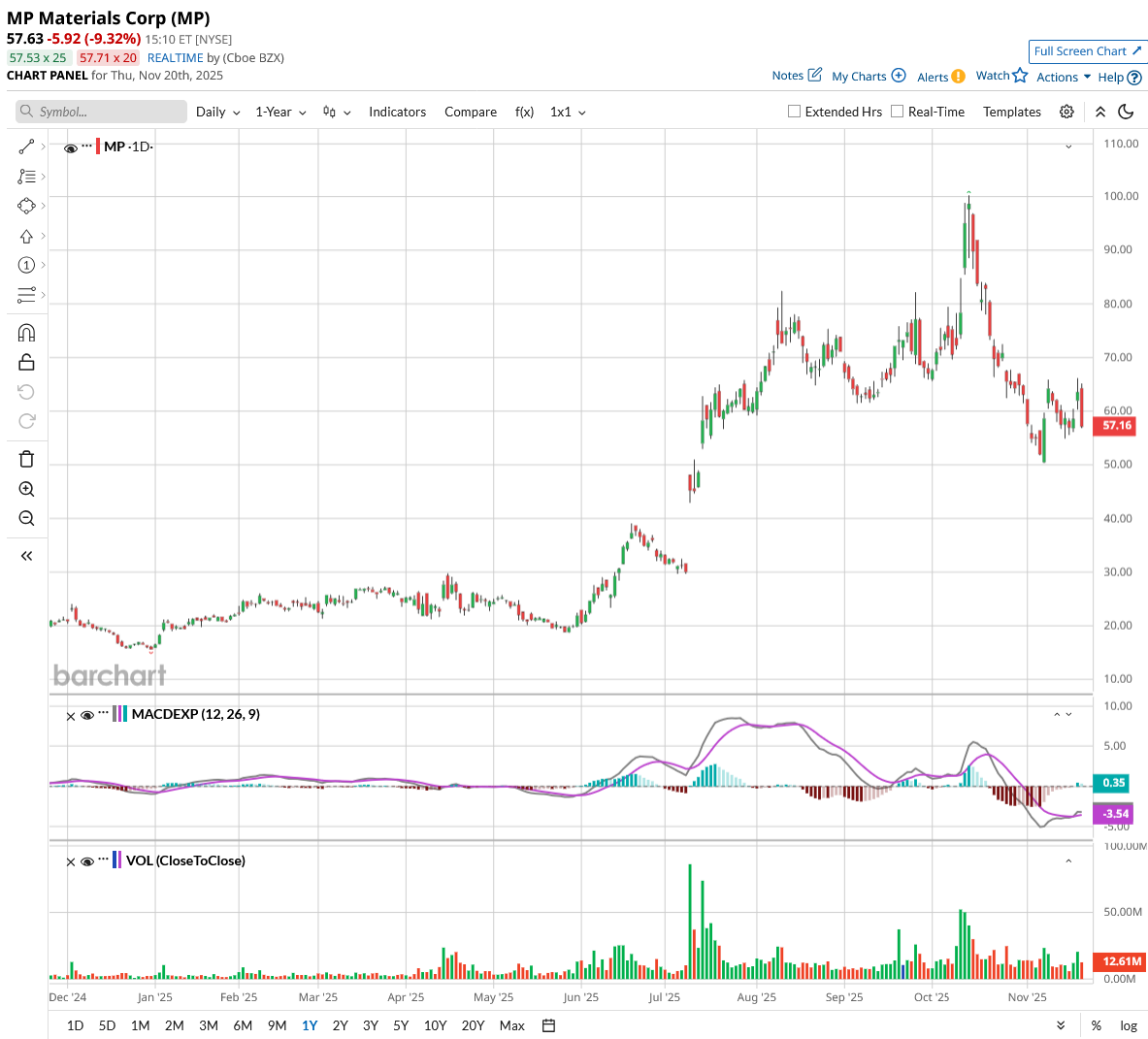 The company is positioned to benefit from the Pentagon's price protection agreement, which began on Oct. 1. This deal guarantees MP Materials will receive at least $110 per kilogram for its rare-earth oxide, whether it sells it or stockpiles it.
