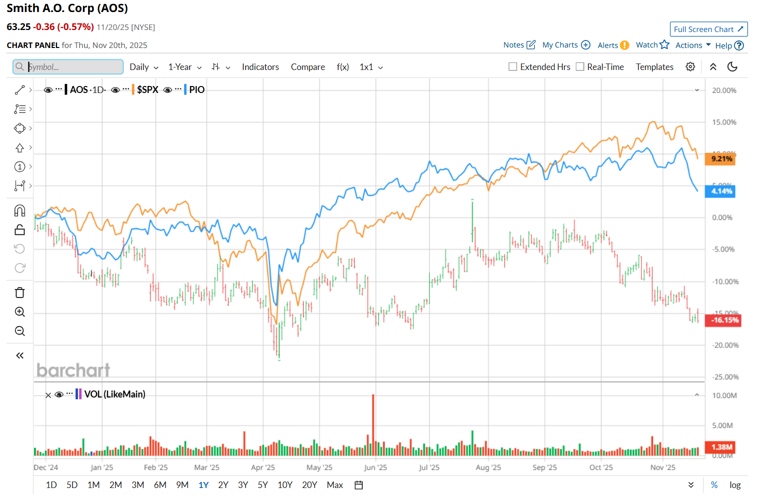Narrowing the focus, AOS has also underperformed the Invesco Global Water ETF (PIO), which has gained 6.4% over the past 52 weeks and 10.7% on a YTD basis.