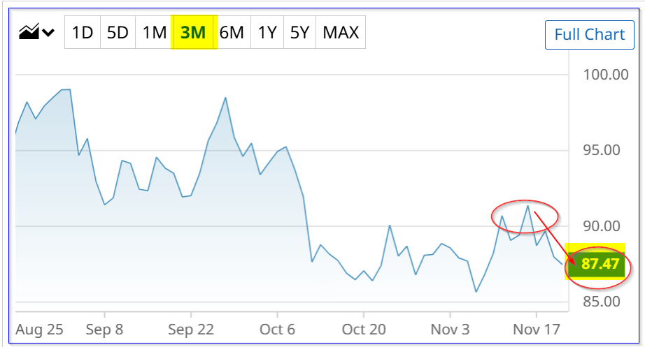COP closed down Thursday, Nov. 20, to $87.47. That is lower than its recent peak of $91.37, which occurred on Nov. 14. That was a week after it released Q3 results on Nov. 6, along with the dividend hike.