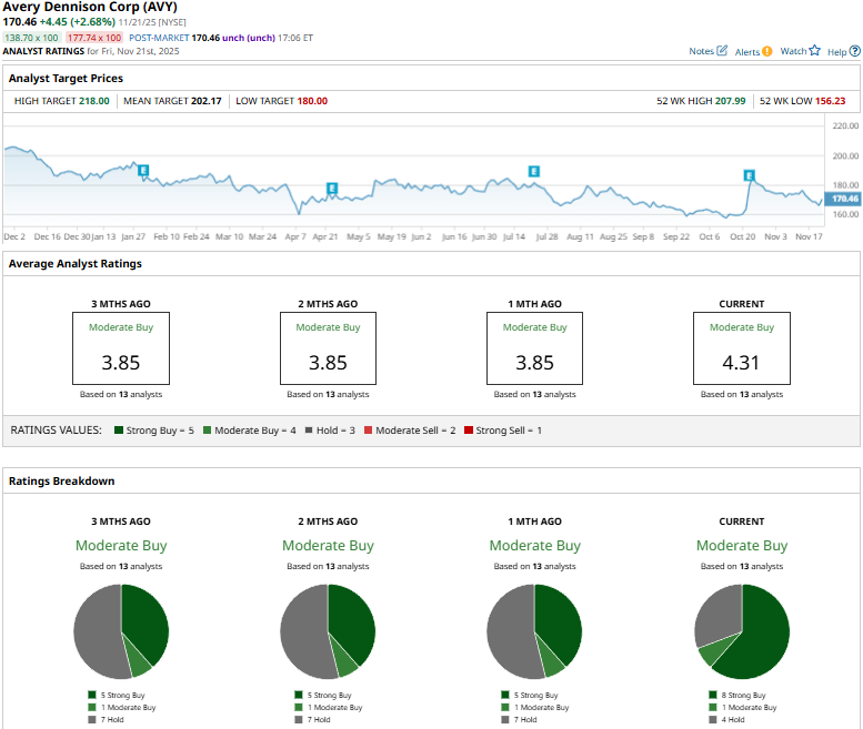 Among the 13 analysts covering the AVY stock, the consensus rating is a “Moderate Buy.” That’s based on eight “Strong Buys,” one “Moderate Buy,” and four “Holds.”