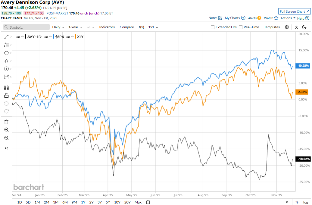 Avery Dennison has substantially underperformed the broader market over the past year. AVY stock prices have plunged 8.9% on a YTD basis and declined 14.6% over the past 52 weeks, compared to the S&P 500 Index’s ($SPX) 12.3% gains in 2025 and 11% returns over the past year.
