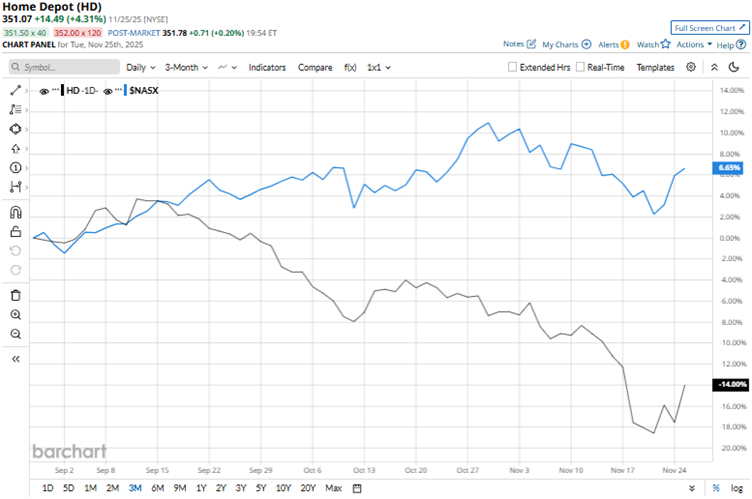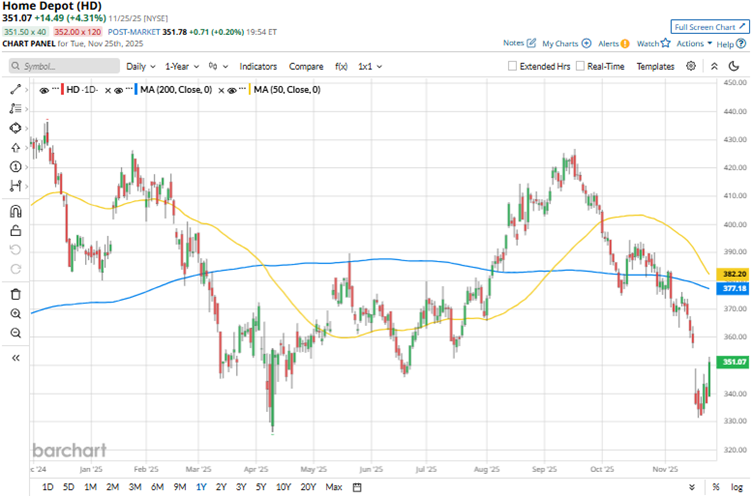 Over the longer term, this underperformance persists. Over the past 52 weeks, Home Depot’s stock declined by 18.1%, while it is down 3.2% over the past six months. On the other hand, the Nasdaq Composite gained 20.8% and 22.9% over the same periods, respectively. Home Depot’s stock has been trading below its 50-day moving average since early October and below its 200-day moving average since early November.