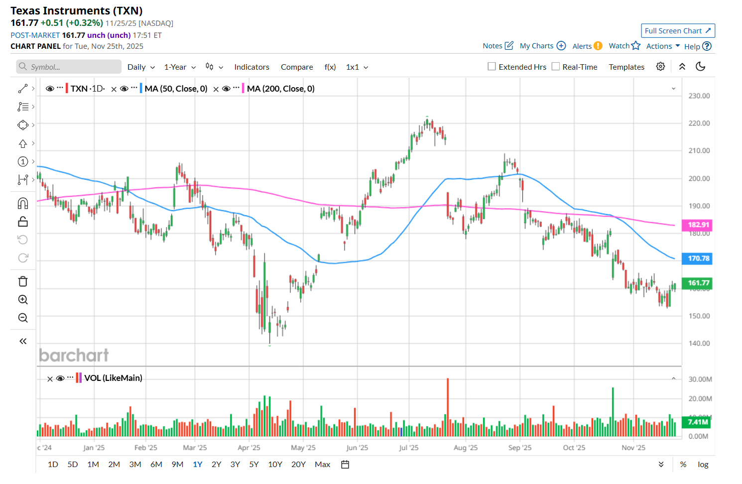 Valued at a market cap of $146.5 billion, Texas Instruments Incorporated (TXN) designs and manufactures analog and embedded semiconductor solutions that power electronic systems across a wide range of industries. The Dallas, Texas-based company serves markets such as industrial, automotive, personal electronics, communications, and enterprise systems.
