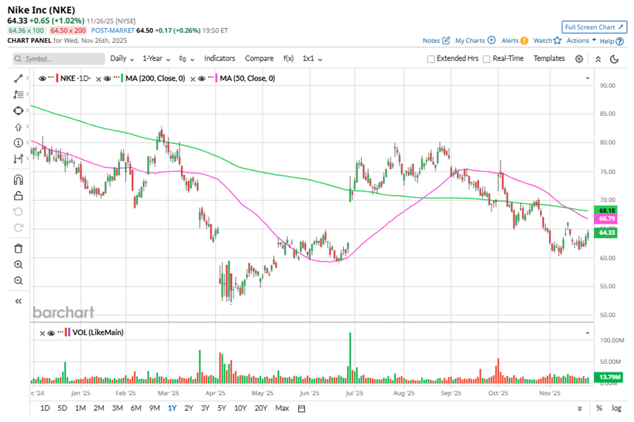 Despite its notable strength, NKE slipped 22% from its 52-week high of $82.44, achieved on Feb. 26. Over the past three months, NKE stock declined 18.2%, underperforming the Consumer Staples Select Sector SPDR Fund’s (XLP) 2% drop during the same time frame.