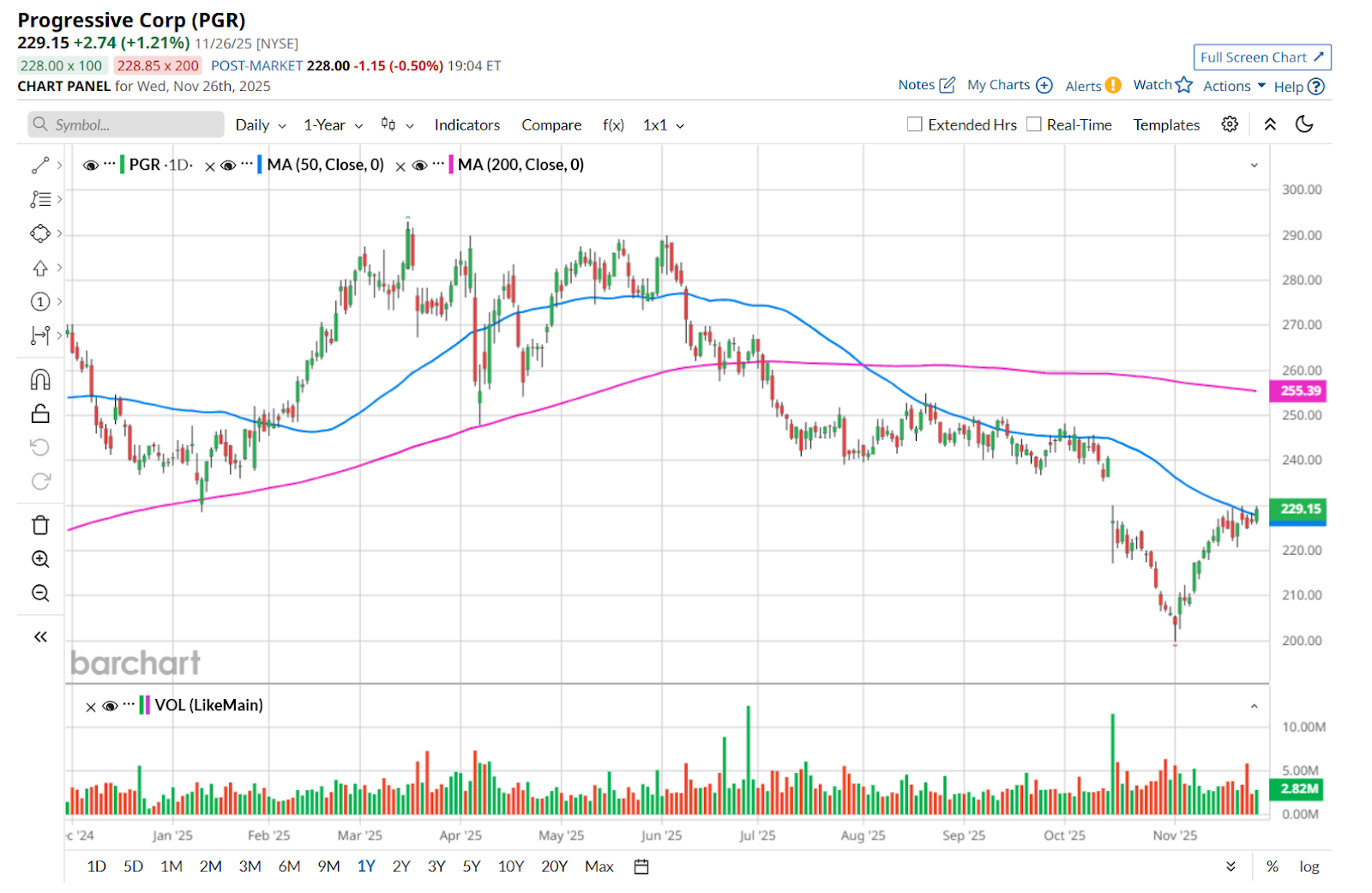 Valued at a market cap of $132.8 billion, The Progressive Corporation (PGR) is an insurance company that provides personal and commercial automobile insurance, along with property and specialty insurance products. The Mayfield Village, Ohio-based company is known for its data-driven underwriting, telematics programs such as Snapshot, and competitive pricing models that tailor premiums based on individual risk profiles.