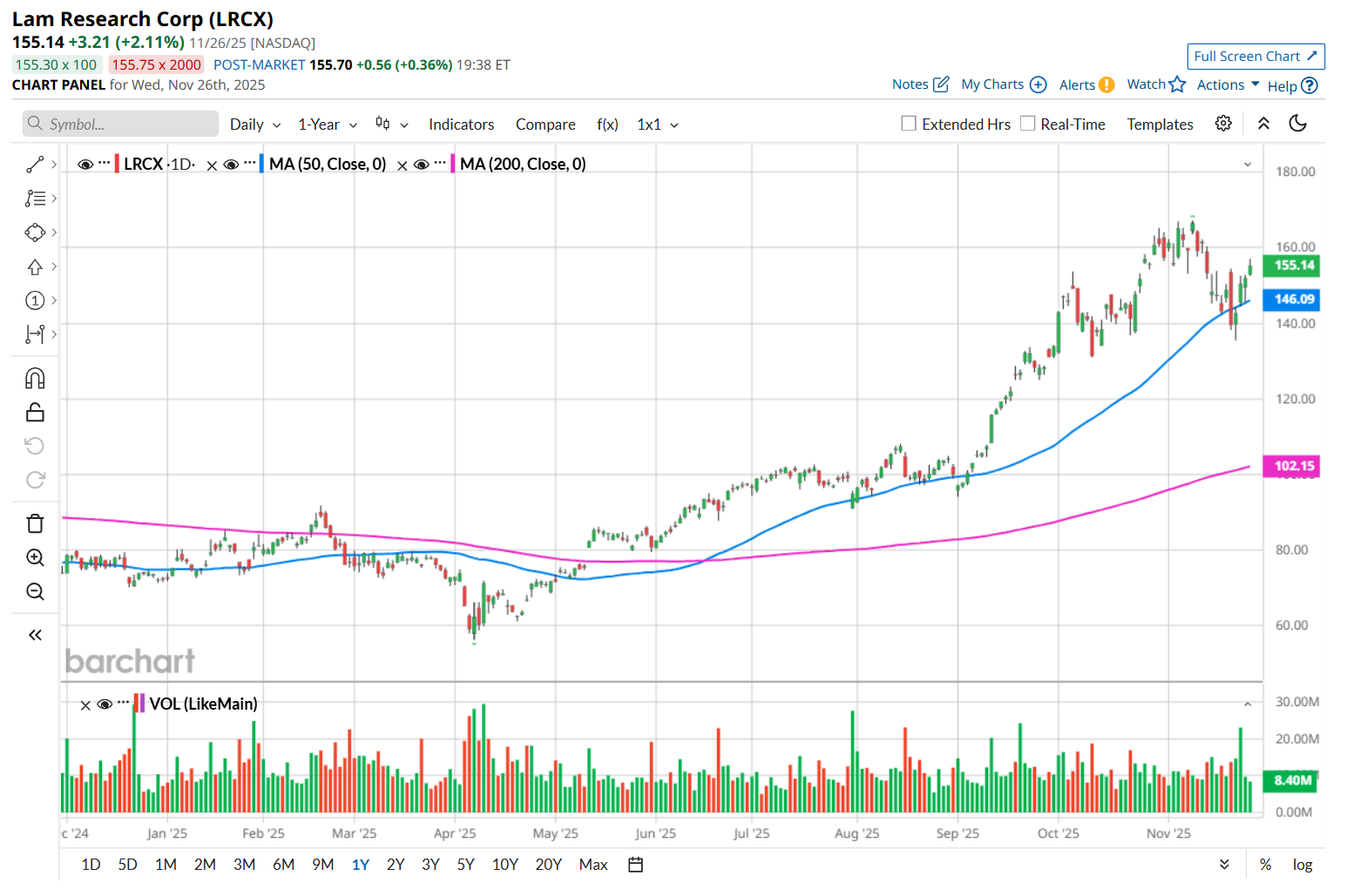 Fremont, California-based Lam Research Corporation (LRCX) is a leading supplier of semiconductor manufacturing equipment and services. Valued at a market cap of $194.9 billion, the company’s solutions play a crucial role in enabling advanced logic, memory, and 3D semiconductor architectures across nodes used in data centers, AI, mobile devices, and automotive electronics.