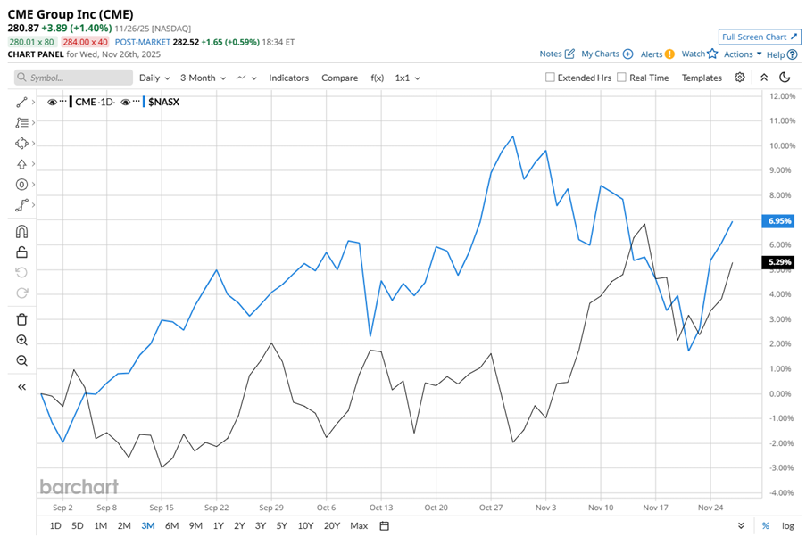 That strength was on display earlier this year when CME stock touched a fresh 52-week high of $290.79 on June 2. While shares currently sit about 3.1% below that peak, the stock’s short-term performance still shows resilience. Over the past three months, CME gained 3.4%, not quite enough to beat the Nasdaq Composite’s ($NASX) 7.8% uptick, but steady enough to show investors are not backing away.