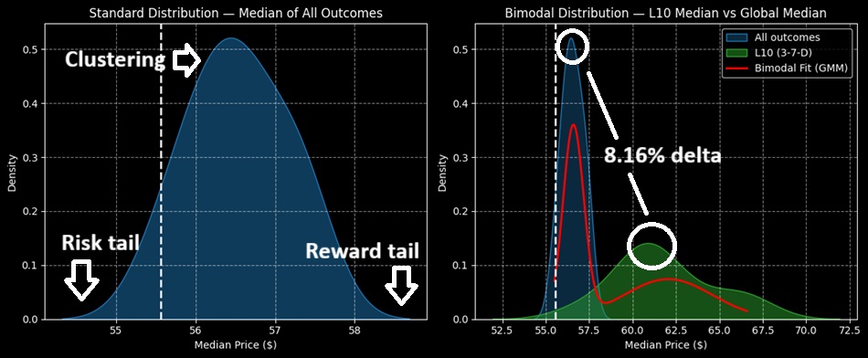 What’s more, the breakeven price for the above spread is $60.50. That’s very much within reach based on price density dynamics. Also, what’s fascinating is that, per the BSM model, the probability of profit of reaching breakeven is listed at only 37%. But based on the Russian axioms above, this figure is in dispute.