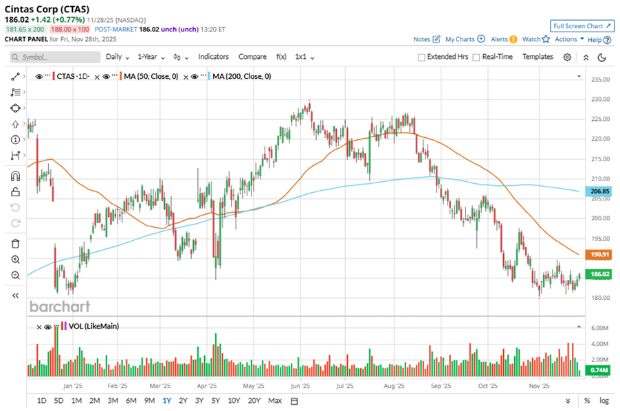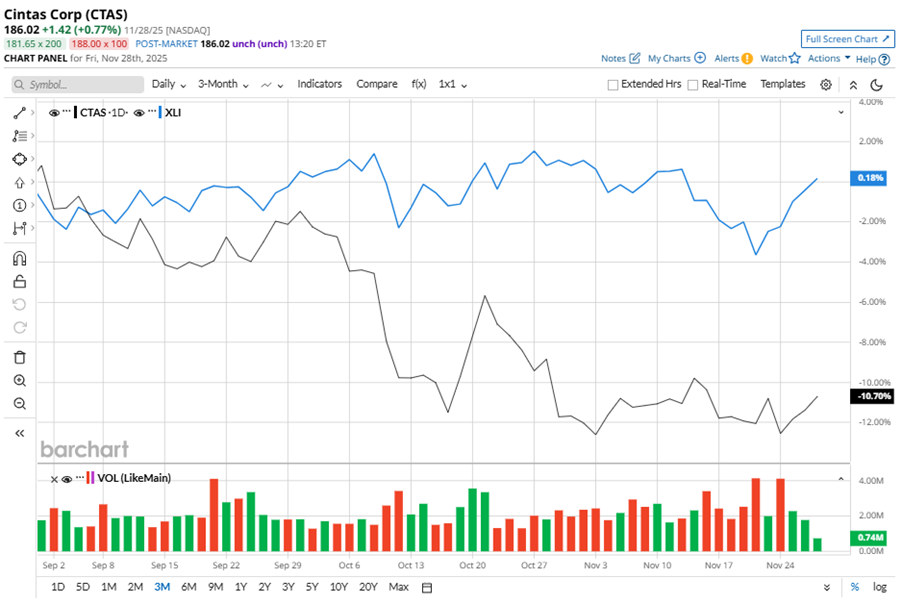Despite its notable strength, CTAS slipped 18.9% from its 52-week high of $229.24, achieved on Jun. 6. Over the past three months, CTAS stock declined 10.7%, underperforming the Industrial Select Sector SPDR Fund’s (XLI) marginal gains during the same time frame.