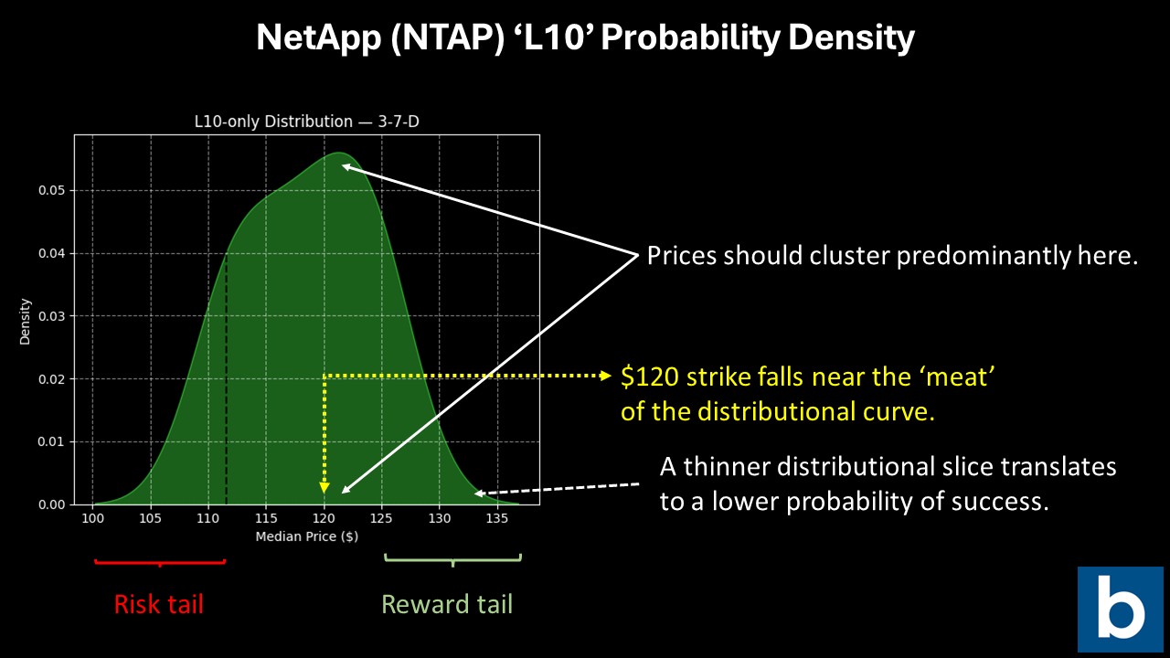 Using the process above, we can arrange the forward 10-week returns of NTAP stock as a distributional curve, with outcomes ranging between $110.50 and $115.80 (assuming an anchor price of $111.56, Friday’s close). Further, price clustering occurs in two spots: $112.75 and $114.