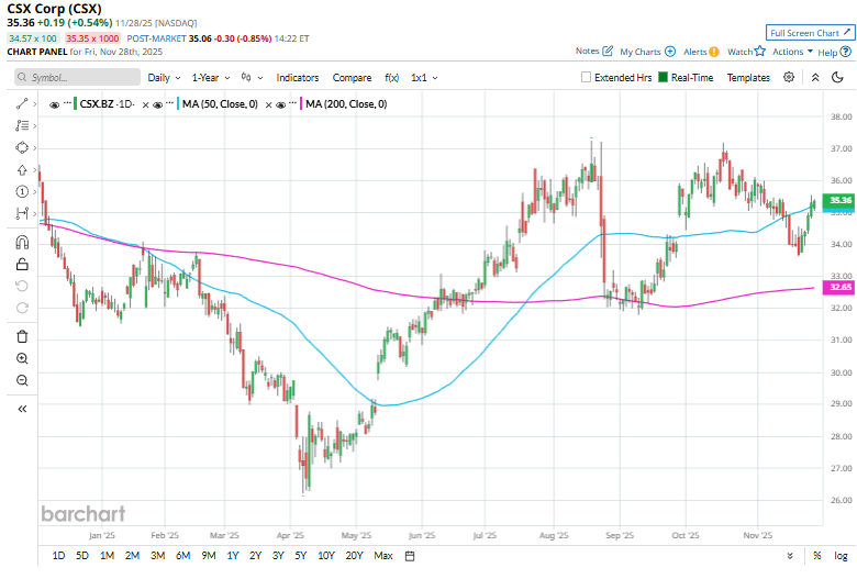 CSX stock has fallen below its 50-day moving average recently and has climbed above its 200-day moving average since September.