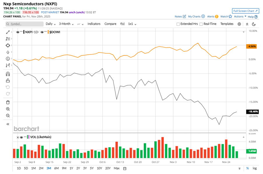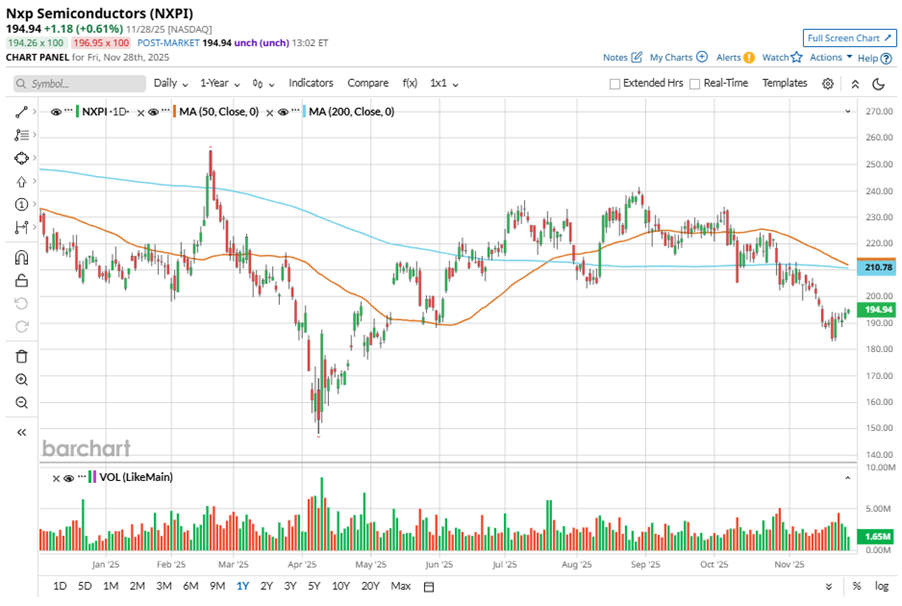 Despite its notable strength, NXPI slipped 23.7% from its 52-week high of $255.45, achieved on Feb. 20. Over the past three months, NXPI stock declined 18.5%, underperforming the Dow Jones Industrials Average’s ($DOWI) 4.6% gains during the same time frame.