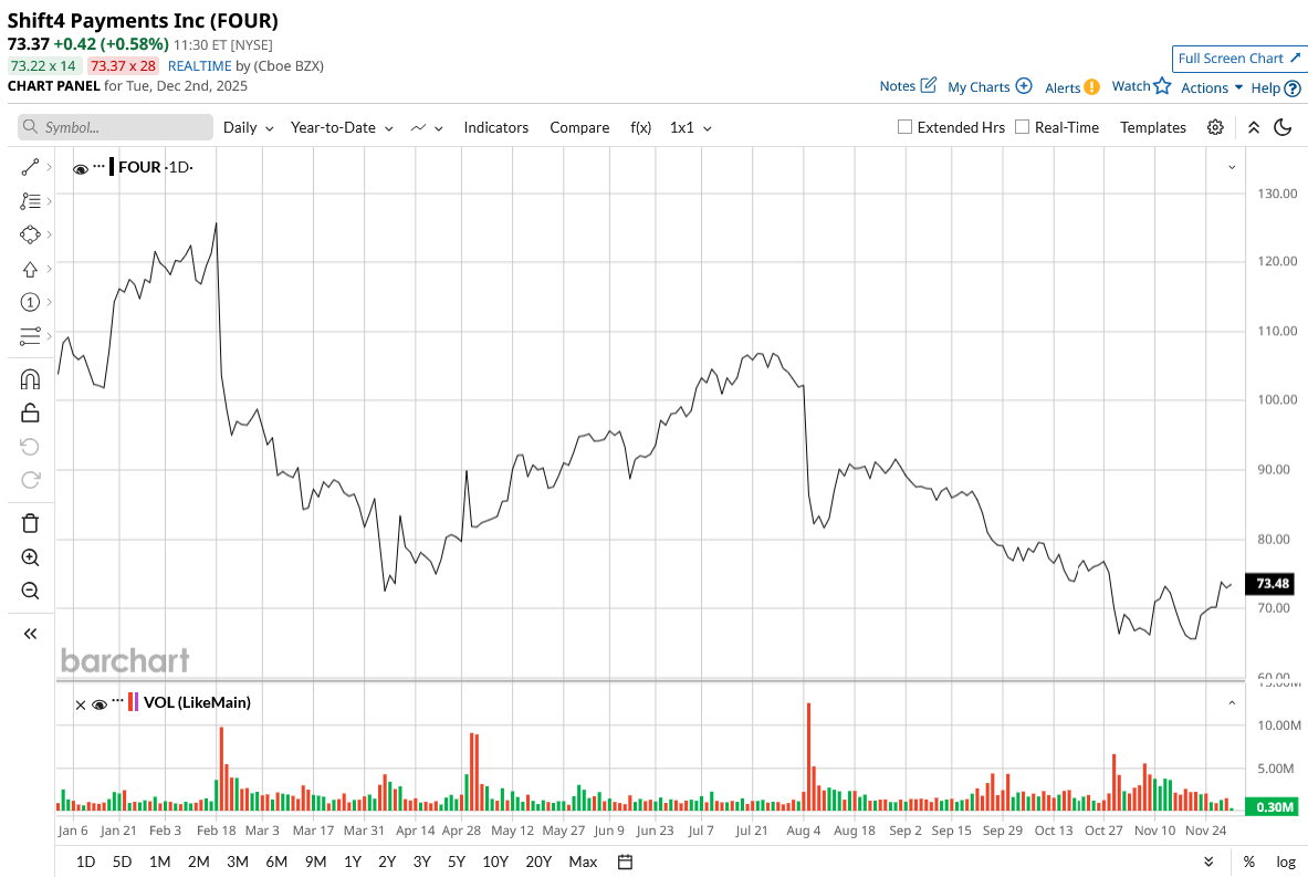 With a market cap of $6.5 billion, FOUR stock is down 29.5% on a year-to-date (YTD) basis.