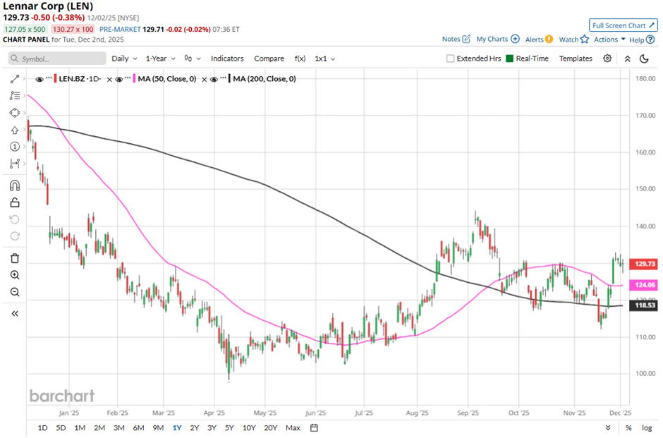 Shares of the Miami, Florida-based company have fallen 26.1% from its 52-week high of $175.65. Lennar’s shares have dropped 2.2% over the past three months, underperforming the broader Dow Jones Industrials Average's ($DOWI) 4.8% gain over the same time frame.