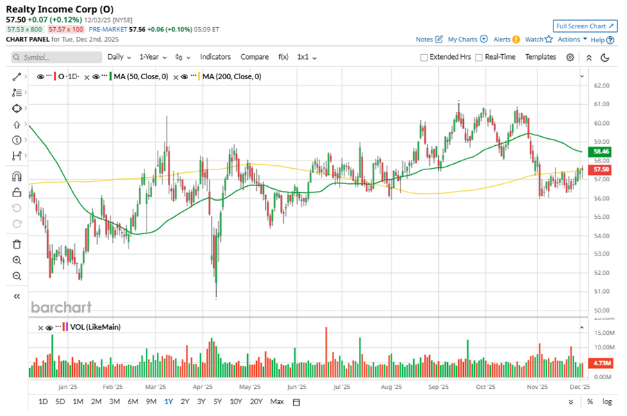 To confirm the bearish trend, O has been trading below its 50-day moving average since late October. Meanwhile, the stock’s current price level is mirroring its 200-day moving average, indicating stability.