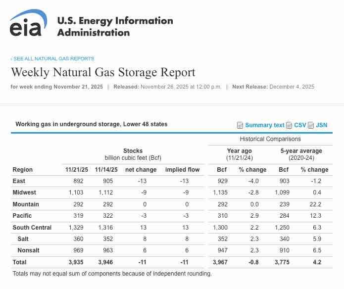 During the week of November 7, 2025, natural gas inventories across the United States reached an annual high. Stockpiles rose to 3.960 trillion cubic feet (tcf) at the end of the 2025 injection season, slightly lower than the previous year when they peaked at 3.972 tcf.