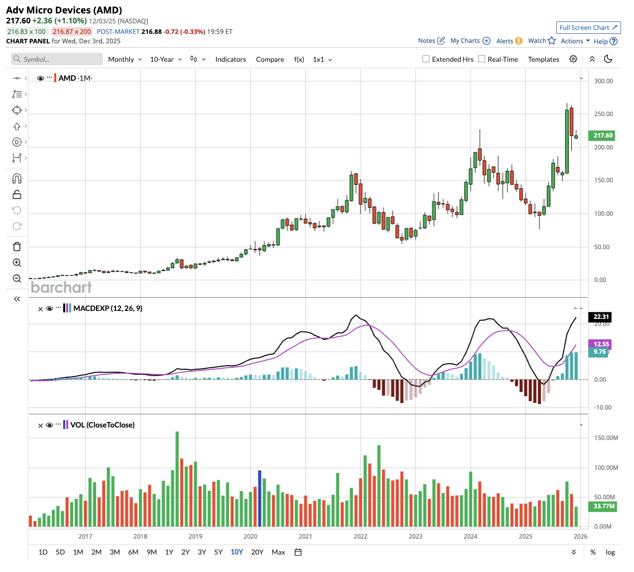 Valued at a market cap of $354 billion, AMD stock is down 18% from its all-time high. Despite the ongoing pullback, the chip stock has returned close to 8,000% over the past decade.
