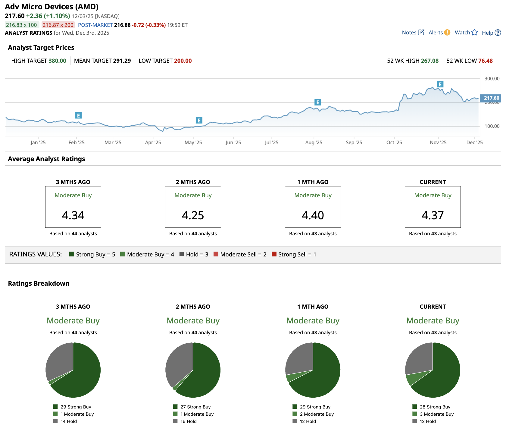 Out of the 43 analysts covering AMD stock, 28 recommend “Strong Buy,” three recommend “Moderate Buy,” and 12 recommend “Hold.” The average AMD stock price target is $291, above the current price of $218.
