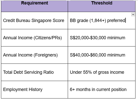 Banks demand comprehensive documentation: tax assessments, CPF contribution statements, recent payslips, and proof of stable employment