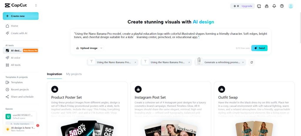 Start by launching the CapCut video and image editor. Navigate to “AI design” from the left vertical menu. Enter a descriptive prompt focused on brush strokes, artistic texture, color flow, and logo subject. Choose a model from the options available below the prompt box. A reference image can be uploaded to influence the brush style and artistic direction.