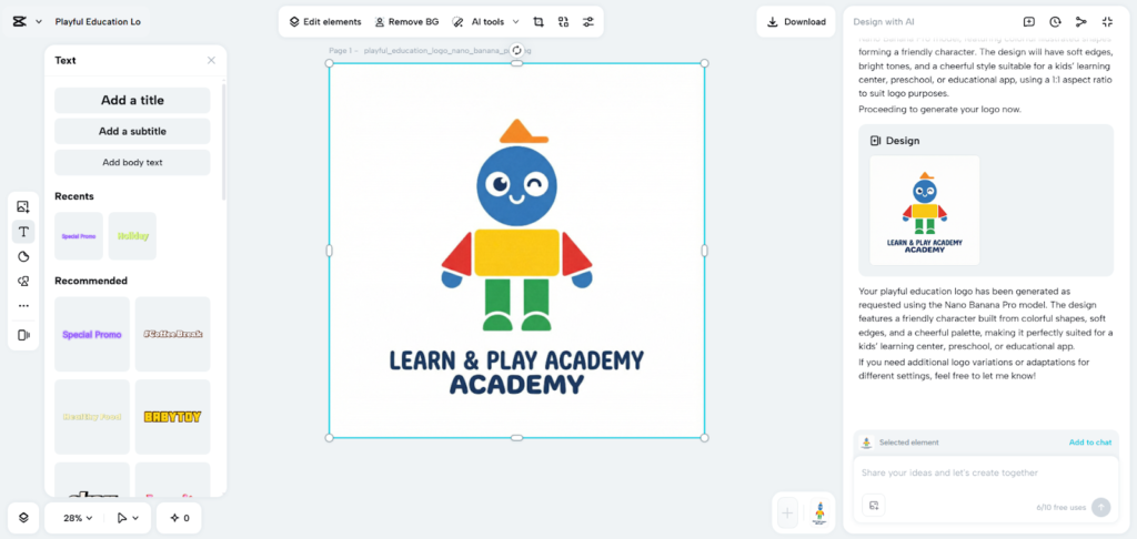 Click the “Send” tab to generate the brush-style logo. The AI evaluates the input and delivers a textured logo design in seconds. Built-in tools such as color correction, background replacement, and AI upscaling allow refinement of brush depth and color contrast. Text, shapes, and stickers can be added to balance creativity with branding clarity.