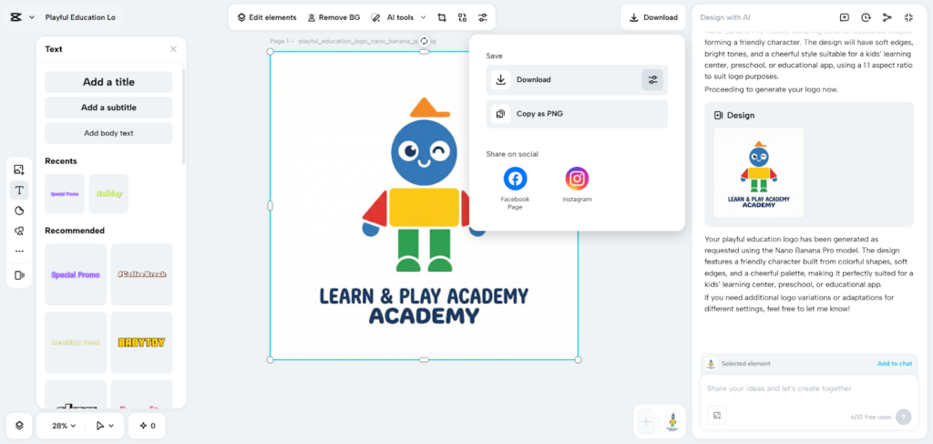 Once the brush logo feels complete, select the “Download” tab at the top-right corner. From the adjacent filters icon, choose the desired format, size, and quality. The logo can also be copied as PNG directly to the local device for immediate publishing.